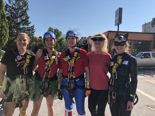 The 2nd Annual Over the Edge Event was hosted by the Council on Aging of Buncombe County in Asheville, North Carolina. Nyda serves on the board of directors for the Council on Aging and served as the MC and radio announcer for the event. It was a beautiful fall day with blue skies, a warm breeze, and loads of folks rappeling off a seven story building. Nyda interviewed each rappeler as they arrived safely at the bottom and engaged the crowds both Friday night and all day Saturday. The proceeds benefit the various programs of the Council on Aging. Nyda is pictured with the Asheville Speciality Hospital folks as they had a team approach to the event and of course, Sister Bad Habits were also on hand for the event. Nyda interviewed both of the sisters and they entertained the street crowds.